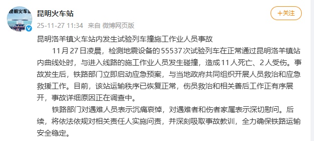 11月27日凌晨,55537次地震设备试验列车在昆明洛阳镇站弯道通过时与进线施工人员相撞,造成11人死亡、2人受伤。事故发生后,铁道部立即启动应急预案,会同当地政府联合组织开展人员救治和应急救援。目前,车站交通秩序已恢复正常,伤者救治及下班后相关工作正在有序进行,事故详细原因正在调查中。铁道部已向遇难者表示沉痛哀悼,并向遇难者和伤者家属表示沉痛哀悼。今后将依法依规追究相关责任人责任,并深刻汲取事故教训,确保安全轨道交通的质量和稳定性。微博截图